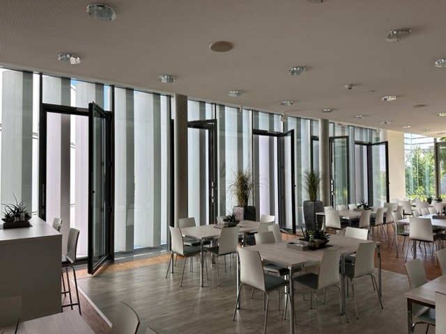 Besten Feuerschutz gibt es auch in der Cafeteria: Die sieben Bestandstüren zur Nachströmöffnung werden jetzt dank neuer Antriebstechnik geöffnet. Die SIMON PROtec-Lösung hierfür ist der Klapparm² PA-KL²-DF Drehflügel in Kombination mit der Produkte.
